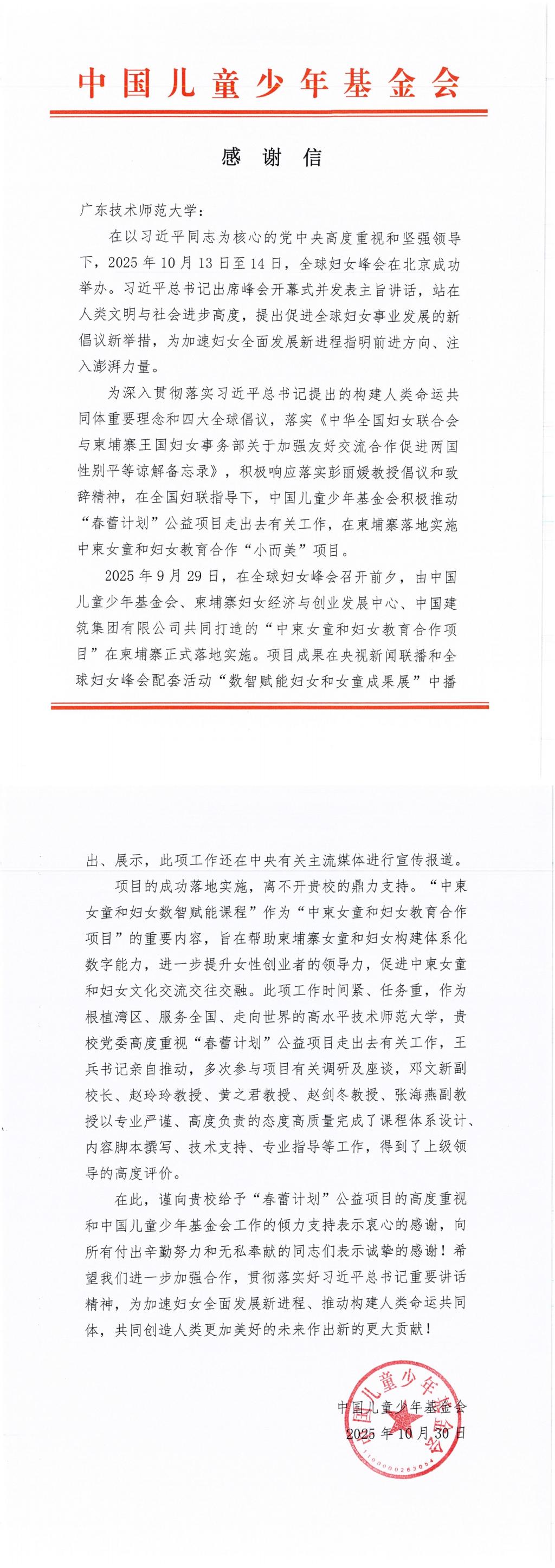 近日,中國兒童少年基金會向廣東技術(shù)師范大學(xué)發(fā)來感謝信,對我校在“中柬女童和婦女教育合作項目”中的鼎力支持與突出貢獻(xiàn)表示誠摯感謝。我校趙玲玲教授團隊承接的數(shù)智賦能課程作為項目核心,隨項目成果亮相央視新聞聯(lián)播與全球婦女峰會配套展覽,成為中柬合作的亮點。9月29日,由中國兒童少年基金會、柬埔寨婦女經(jīng)濟與創(chuàng)業(yè)發(fā)展中心及中國建筑集團有限公司聯(lián)合打造的“中柬女童和婦女教育合作項目”在柬埔寨正式落地實施。該項目...